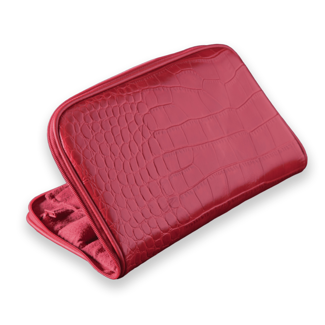 Elevate your style with the Connoisseurs Leather Red Jewellery Clutch, a luxurious accessory that combines sleek design with exceptional protection. Crafted from high-quality red and black leather alligator grain, this clutch exudes sophistication and refinement.