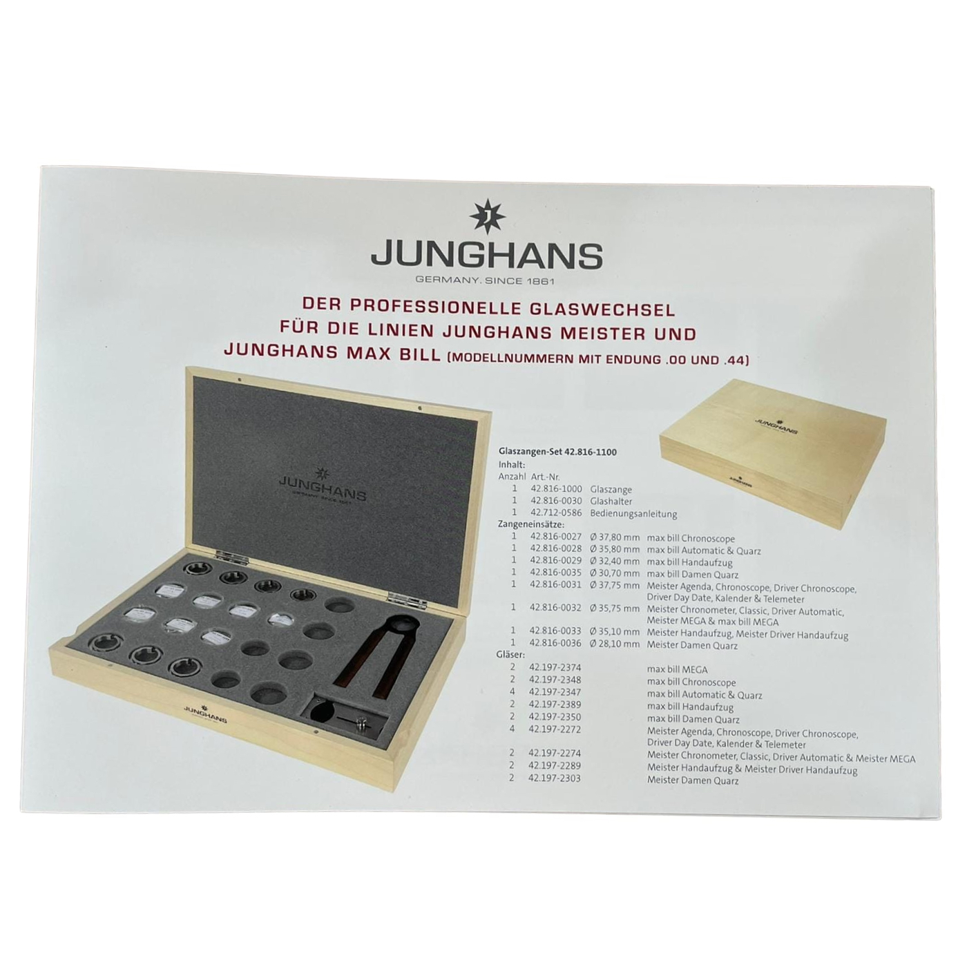 This professional glass gripper replacement set is designed to provide a secure and damage-free fitting solution for Junghans glasses. With its clear wooden box delivery, this set offers a convenient and elegant storage option. Perfect for watch enthusiasts who value precision and craftsmanship.